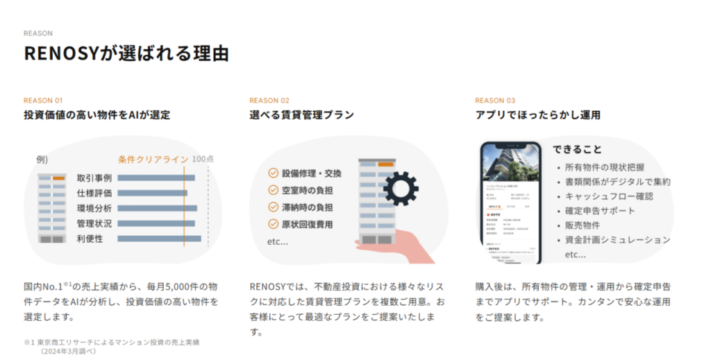 リノシー(RENOSY)は、独自AIと独自のデータベースを駆使して不動産投資を行います。
