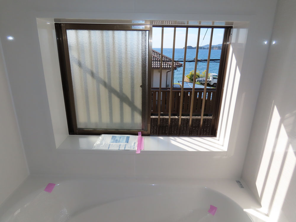 浴室からは海が見え温泉も利用可。