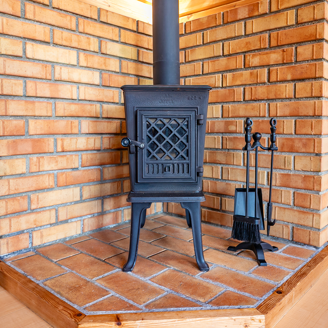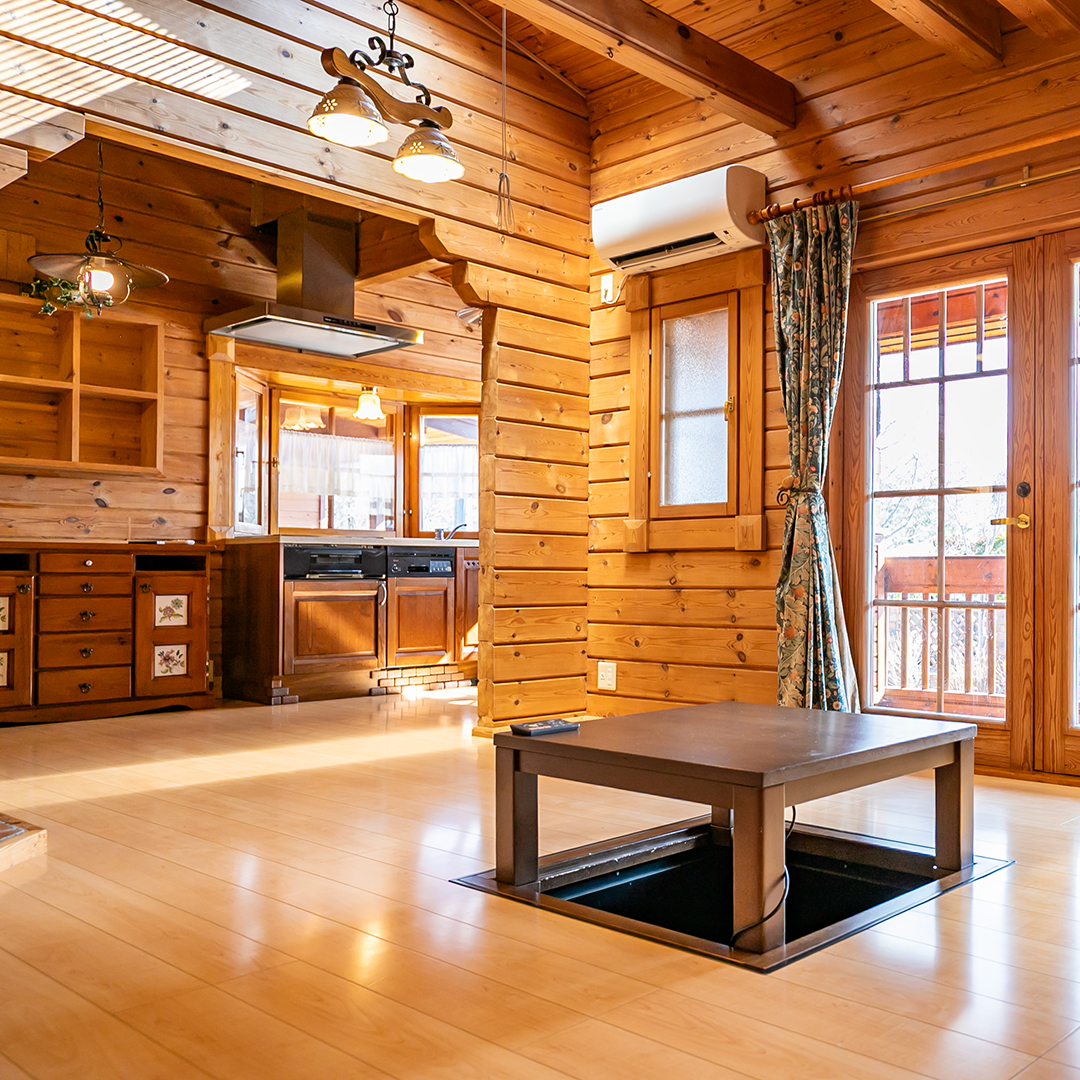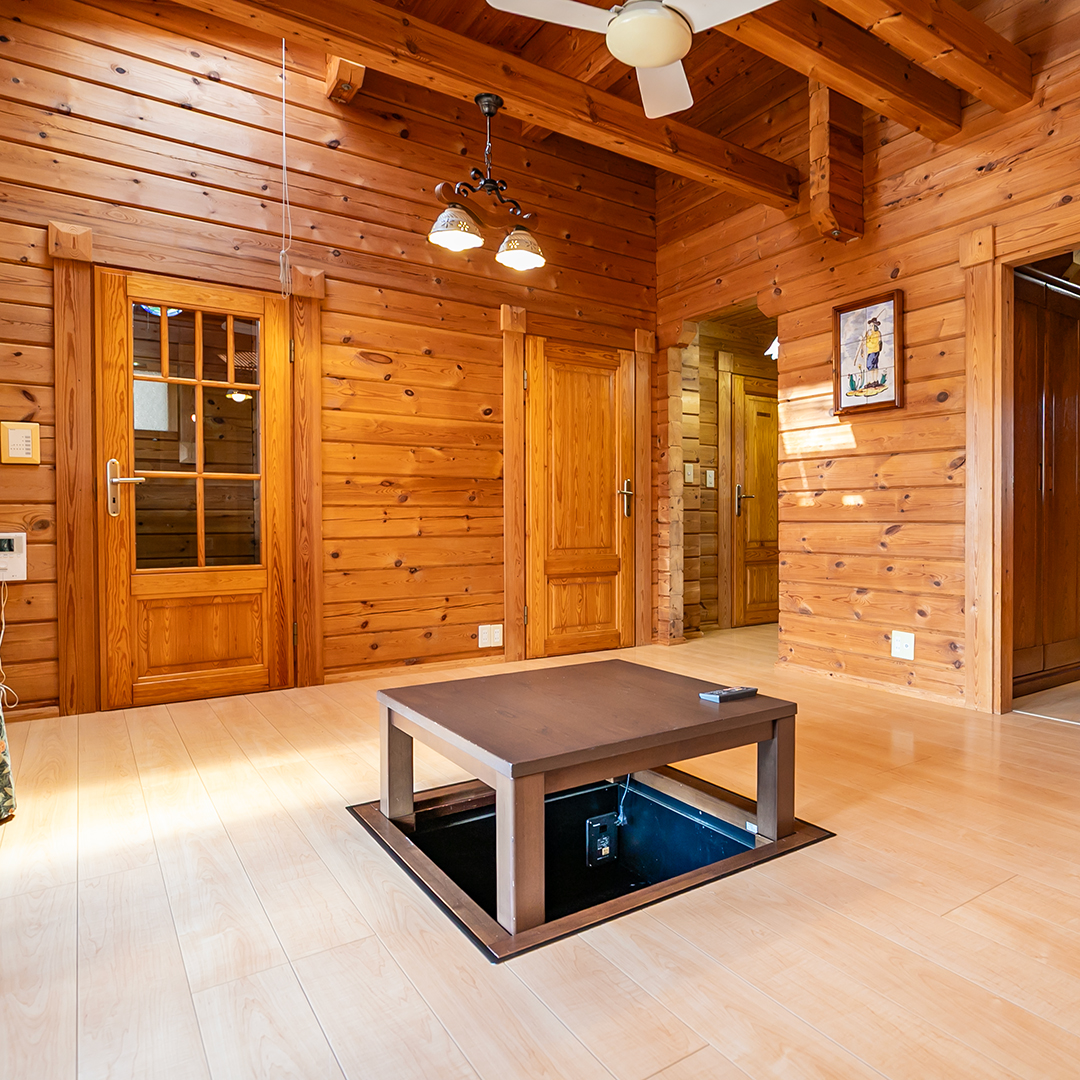 9.5帖のリビングには、冬の寒さを和らげる薪ストーブと堀こたつが設置され、家族団らんの温もりある時間を演出します。