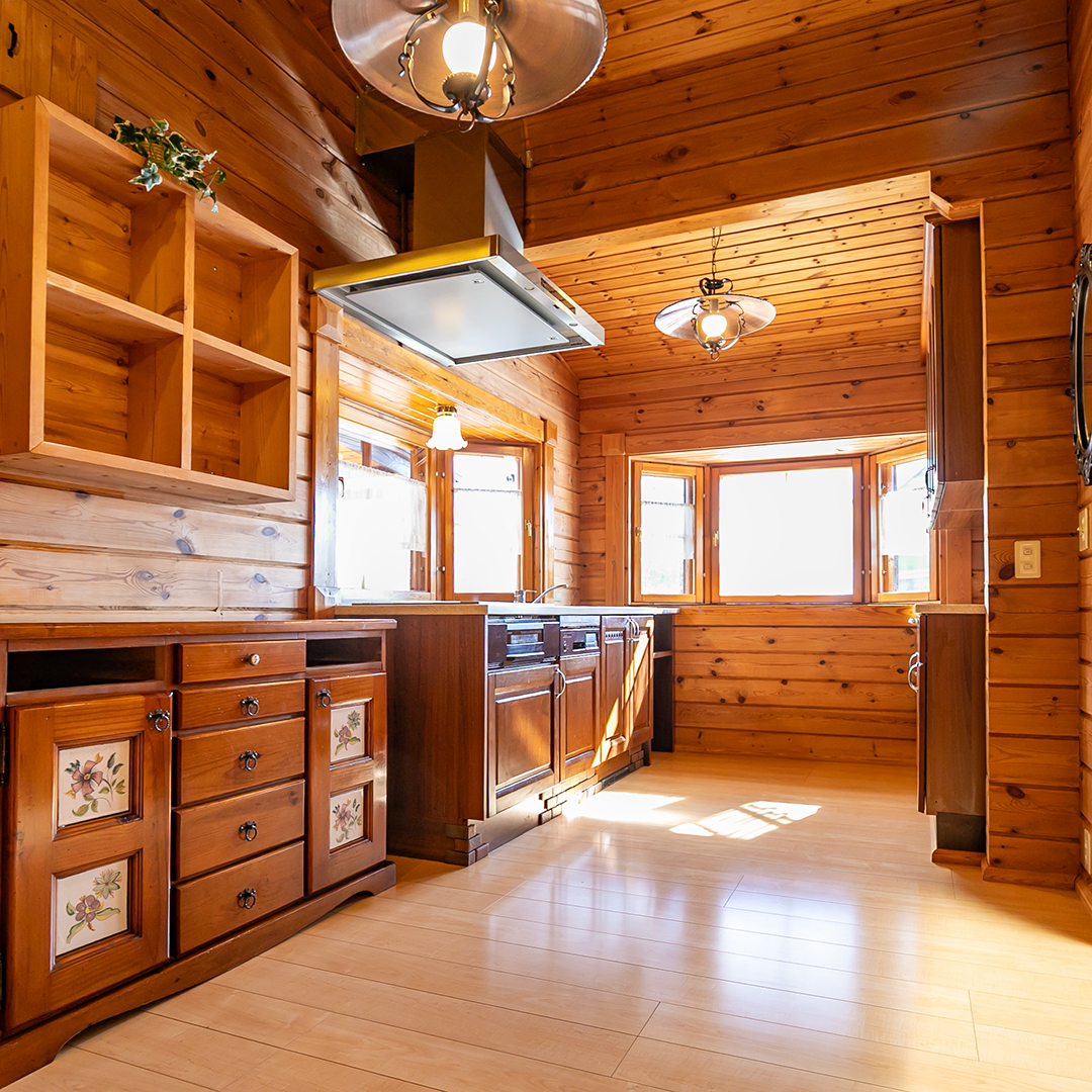 滋賀県高島市今津町にある本物件は、自然に囲まれたゆとりある敷地(104坪)に本棟と別棟の2棟が建つ魅力的なログハウスです。