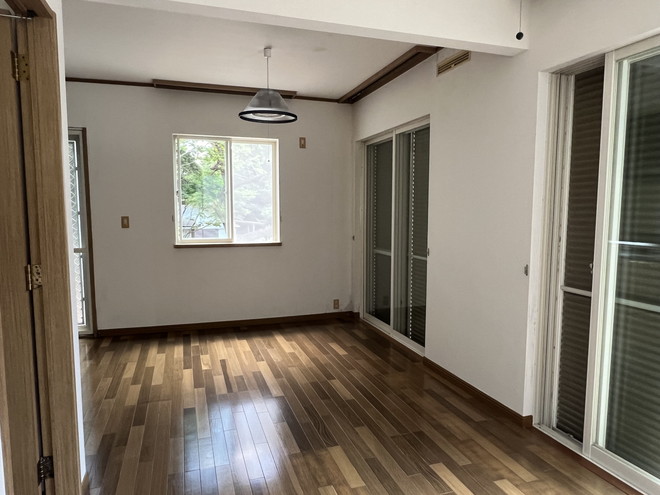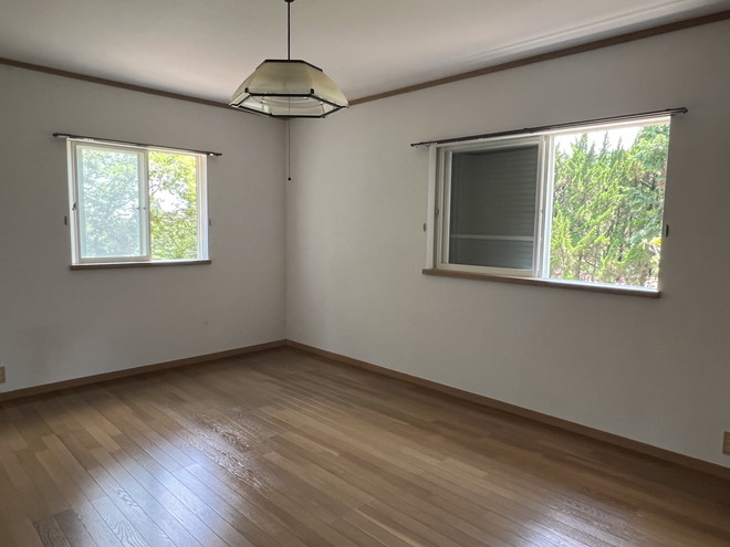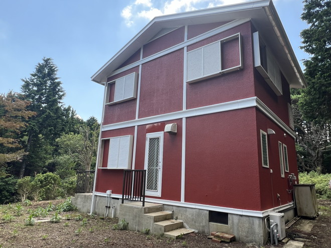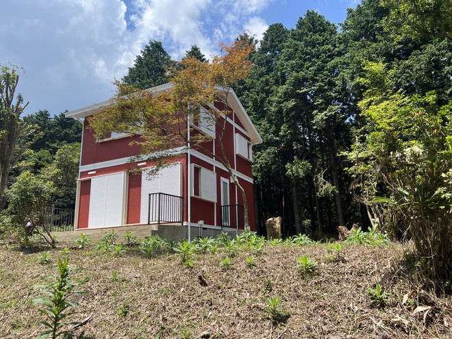北欧風な外観の戸建てです。広々とガーデニングを楽しんでいただける敷地もあります。お車で数十分のところには日帰温泉施設もあります。