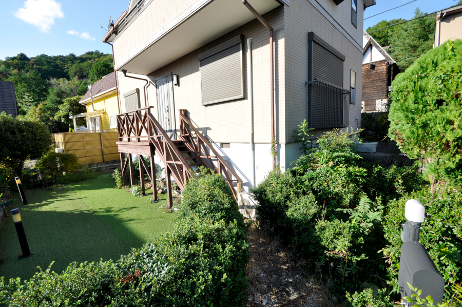 お家の南側の1段下がったところに、1台駐車できるスペースと庭木スペースがあります。