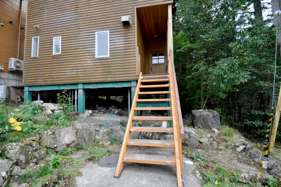 傾斜地に建っていますが、鉄骨の土台がしっかり支えているので安心です☆アプローチの階段を上がり、ウッドデッキの通路を進むと玄関です。