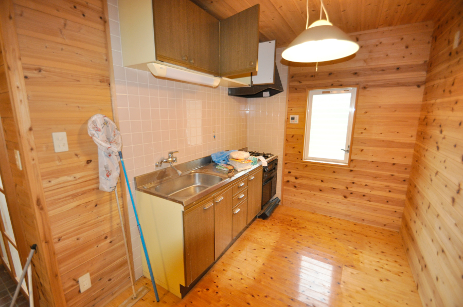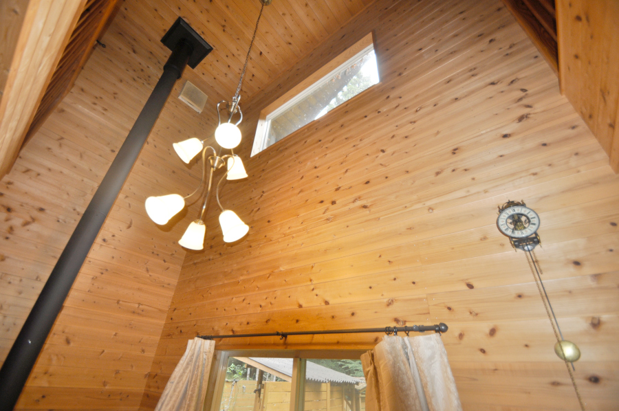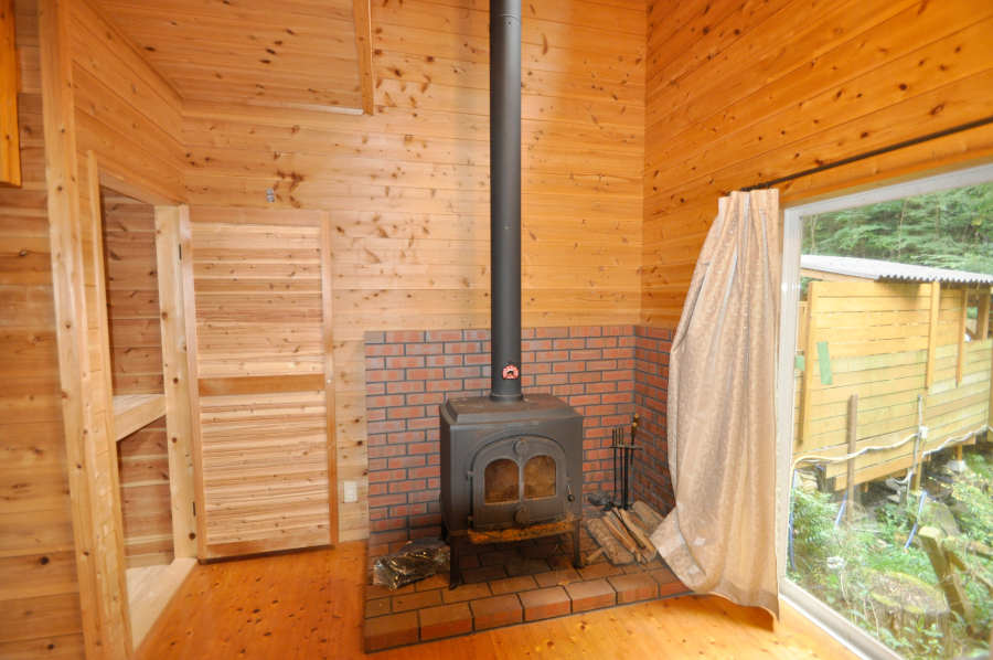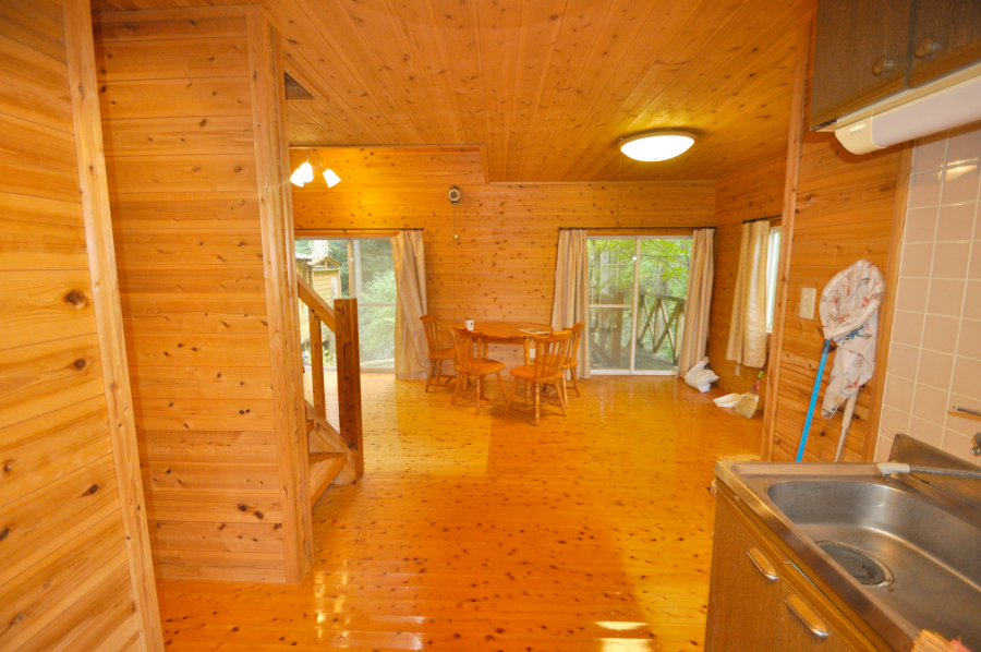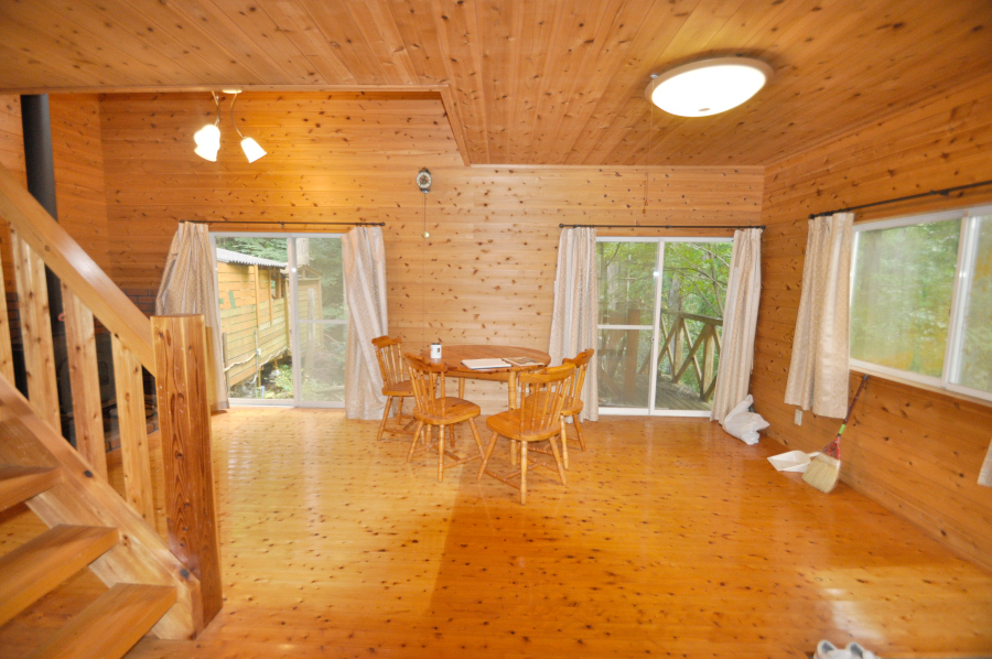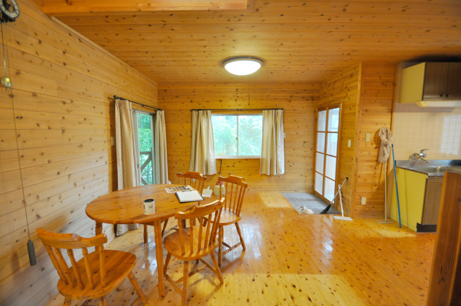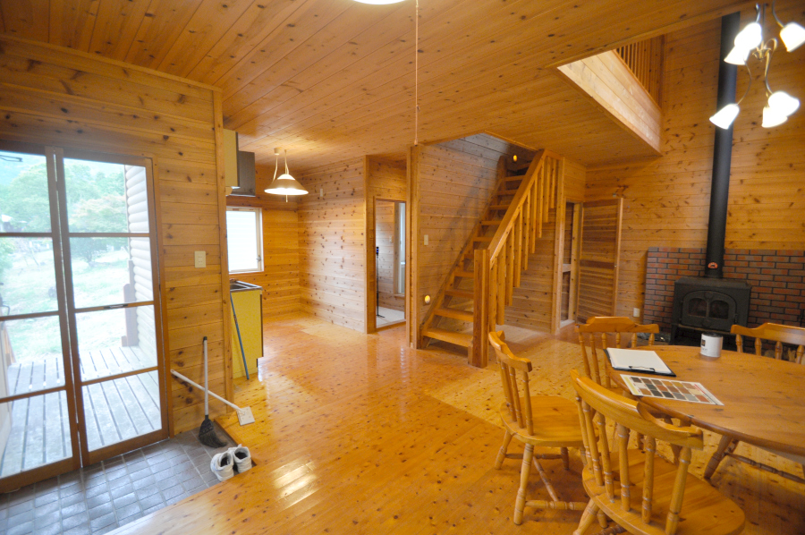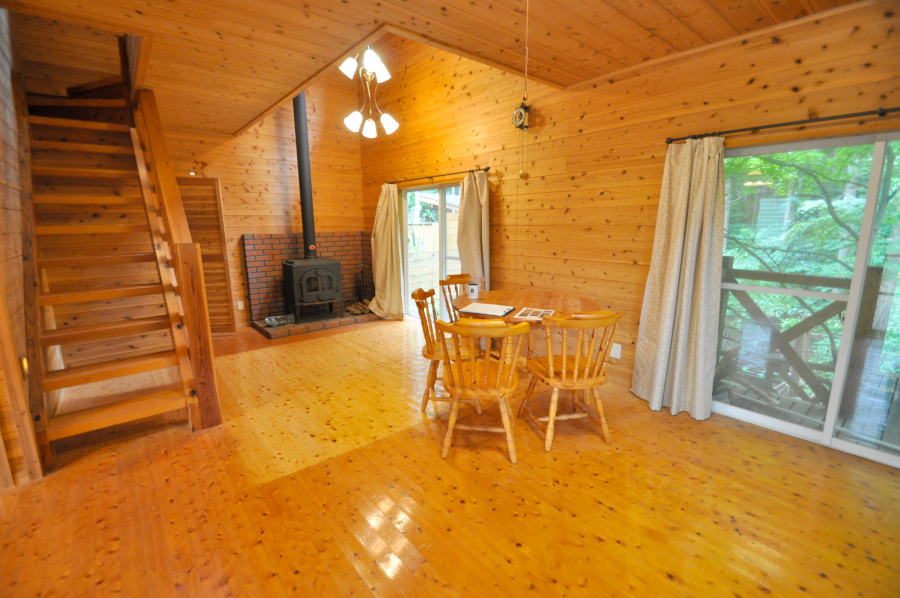 ドアを開け中に入ると部屋一面が板張り、山小屋に来たなってワクワクしますよ♪リビングには、薪ストーブがあるので寒くなっても大丈夫!